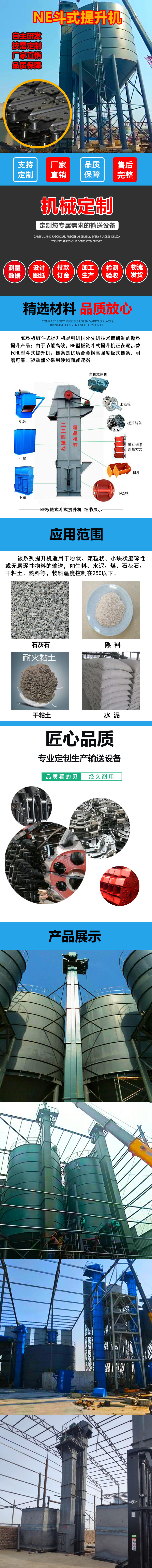 NE型提升机系流入式喂料,物料流入料斗内靠板链提升到顶端,在物料重力作用下自行卸料。本系列提升机规格多(NE15~NE800共11种)提升量广;且生产能高,能耗较低,该机采用全封式机壳链速低,几乎无回料现象,因此无功功率损耗少,噪声低,寿命长。